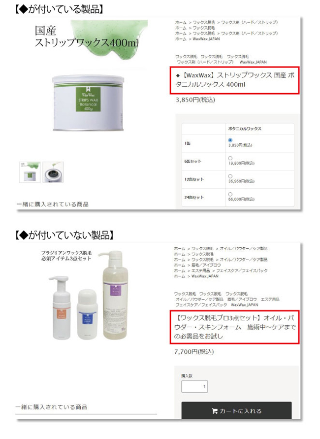 一般社団法人 日本ブラジリアンワックス協会会員様への特別価格につきまして、製品名のはじめに「◆」マークがついている製品は、以下の通りです。